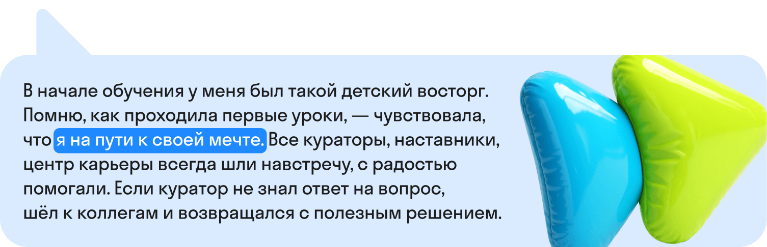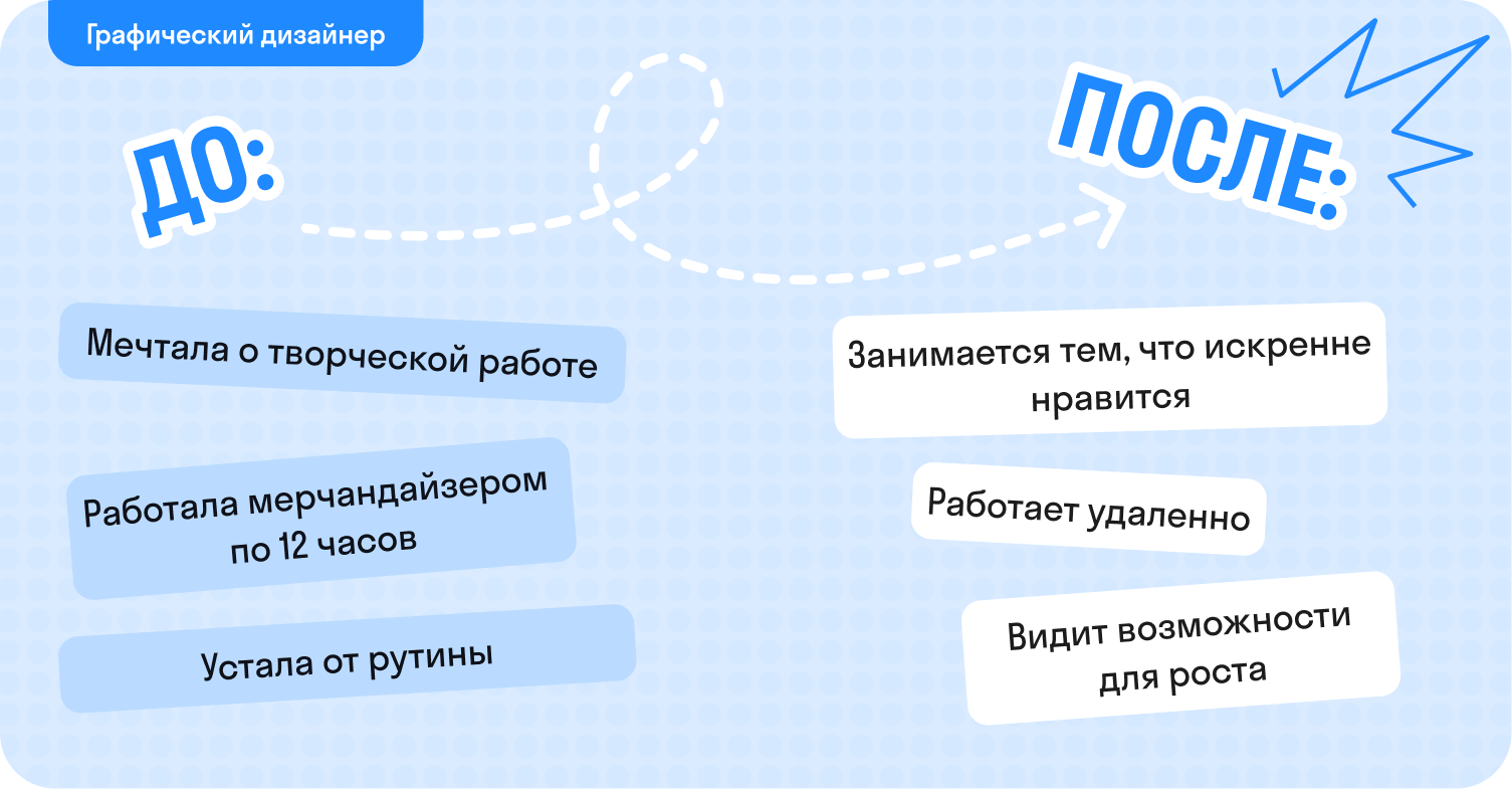«Сравнивала с другими школами. Skypro отличался тем, что охватывал все направления графического дизайна — не только веб-дизайн или брендинг, а полную базу. Для тех, кто еще не определился и хочет попробовать все сферы, это лучшее решение. Плюс гарантия трудоустройства, диплом государственного образца, аккредитованный университет. Выбор был предопределен».