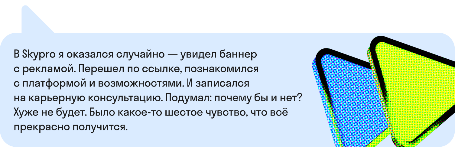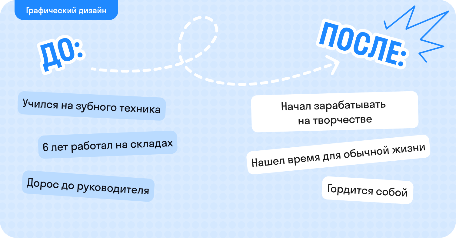 С карьерным консультантом общался около часа. Он дал мне небольшой тест, ответил на все вопросы. Графический дизайн показался отличной идеей. Решил просто попробовать, но учеба зацепила сразу. Курс органично вошел в мою жизнь. И платформа была очень удобная. Если были сложности, помогали преподаватели или одногруппники.
