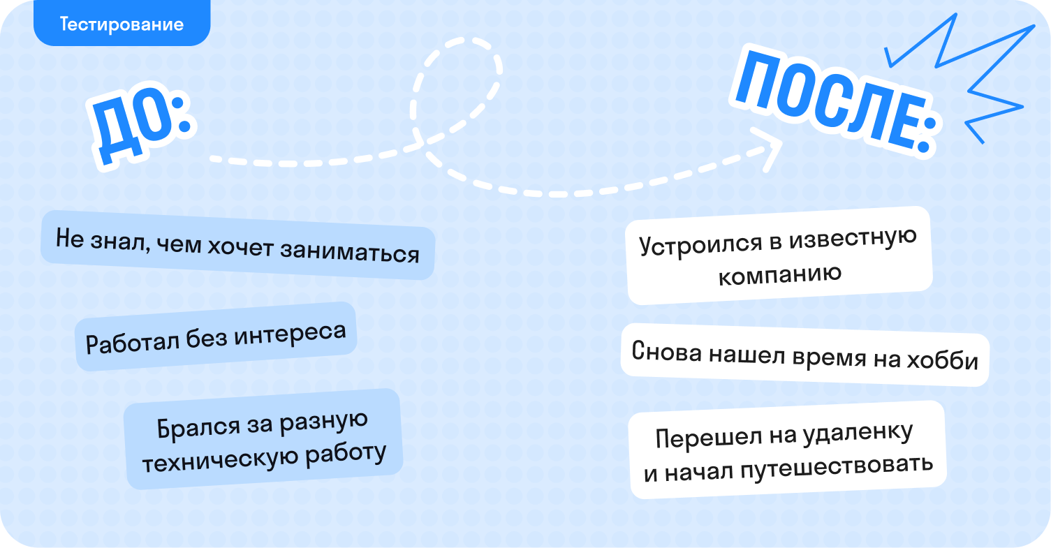 Долго думал, куда идти дальше с этим багажом опыта. Увидел рекламу Skypro — и решил учиться тут. Запомнилась классная теория и подача от преподавателя. Редко приходилось бегать за какими-то уточнениями по базовой теории в интернет. Плюс хочется отметить Эльвиру из центра карьеры: с ней мы провели всего пару собеседований, и я немного отредактировал свое резюме, после чего получил предложение о работе.