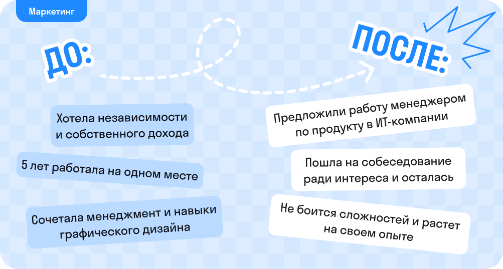 Зарплата на старте — 40 000 ₽. Я понимала, что изначально доход будет небольшим. Ведь можно сказать, я начинаю с нуля в новой сфере. Раньше работала в дизайне, потом немного освоила маркетинг, а сейчас устроилась продактом. Для моей карьерной траектории это вполне достойная зарплата.
