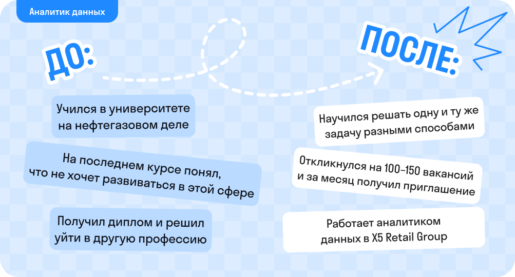 Меня взяли аналитиком данных в X5 Retail Group. Я целенаправленно искал средние или крупные компании. Рад, что попал именно в крупную. Это очень полезно для первого опыта: здесь можно наиболее эффективно прокачать личные качества.