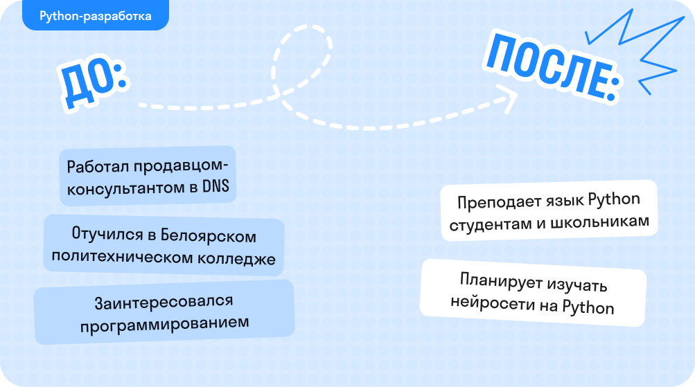 Я окончил Белоярский политехнический колледж. На момент старта учебы работал продавцом-консультантом в DNS.